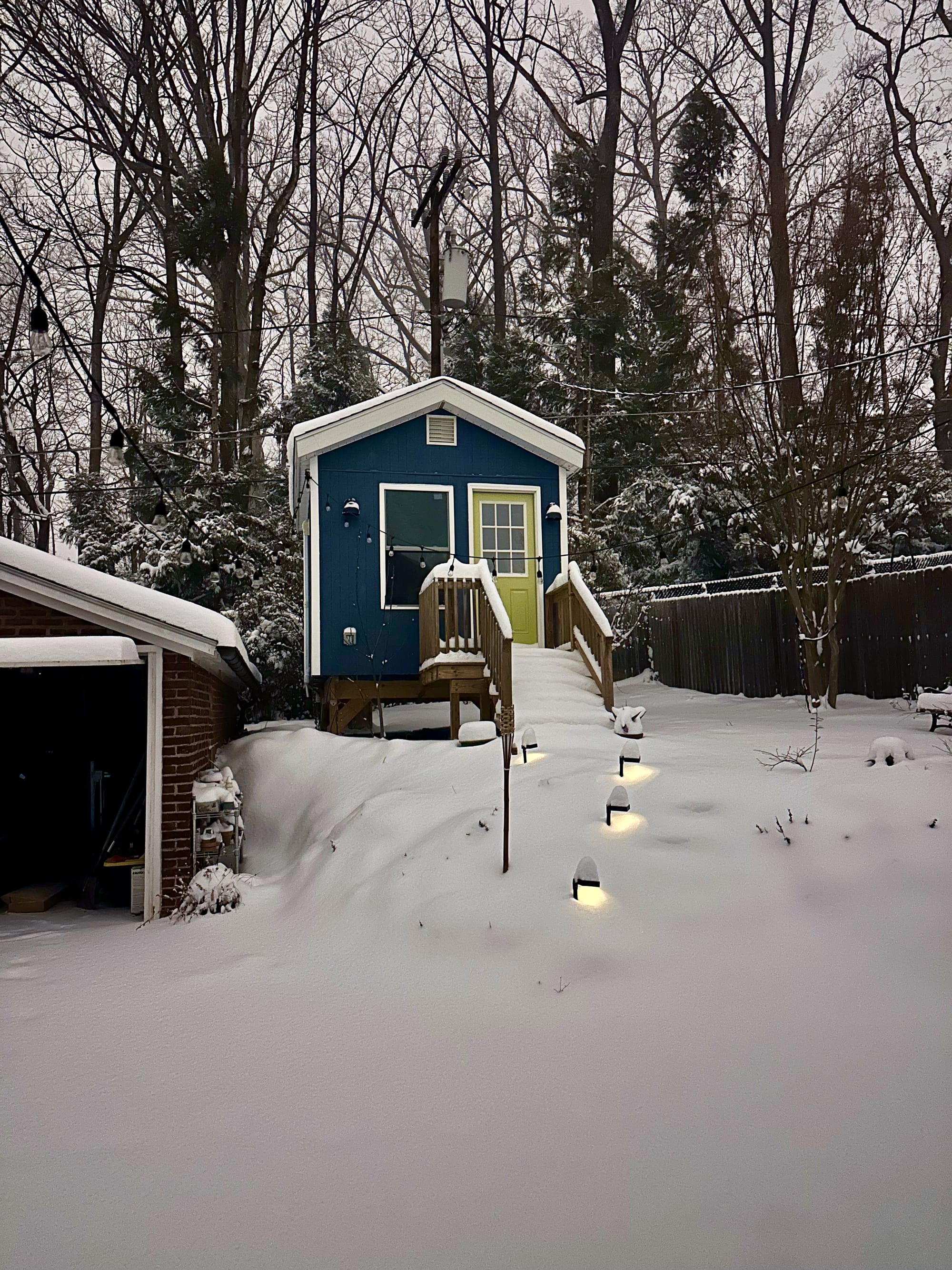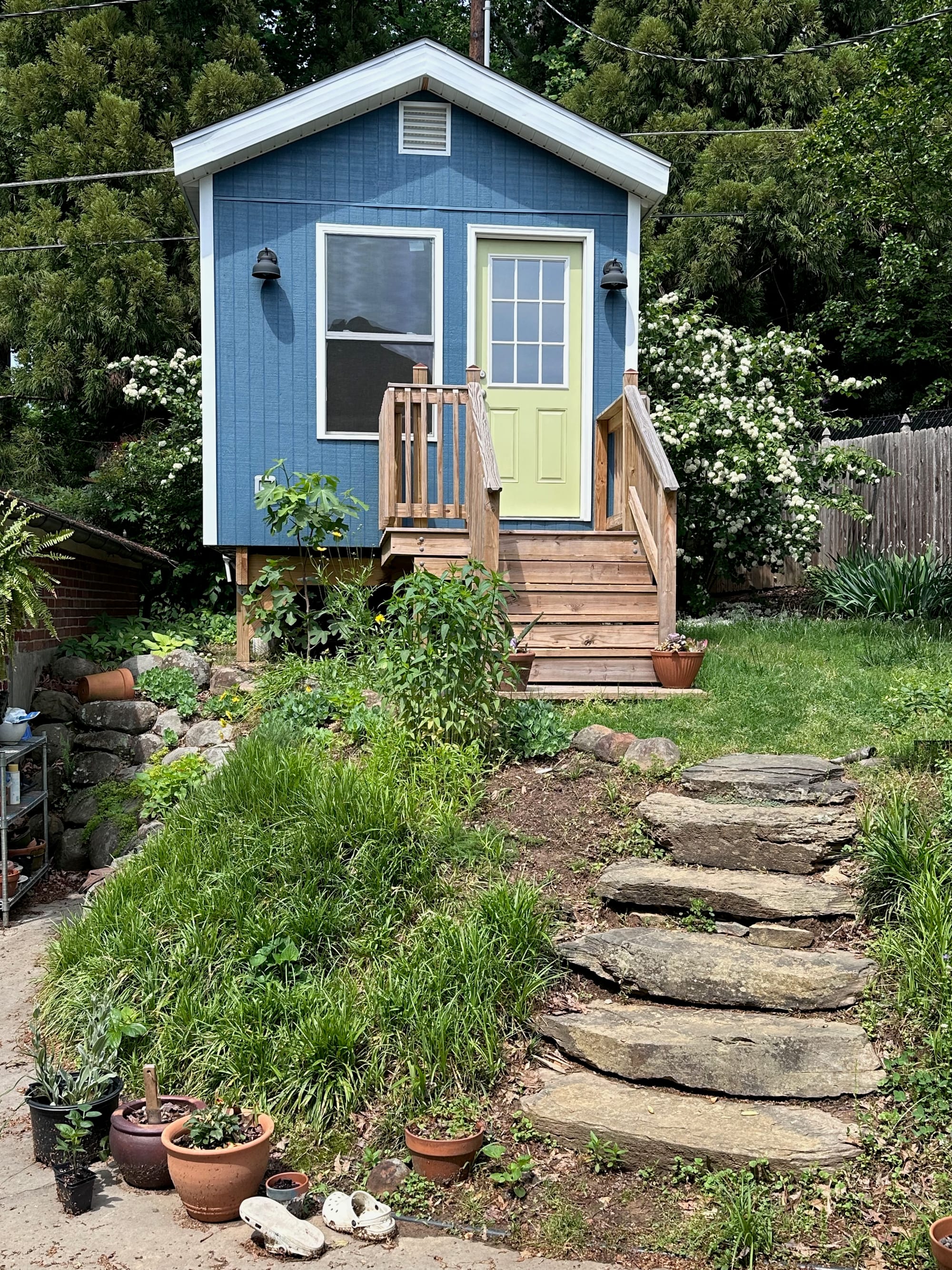 We had to think about placement of “the shed.” I knew I wanted to get the morning sun in the front with a big window to let the light in. After some discussion, we decided to put the building in the back corner of our lot next to our garage. This would put it up and away from the rest of the house, like sitting on its own perch. It would also have a nice view of the morning sun and trees to the back of our property for some privacy.