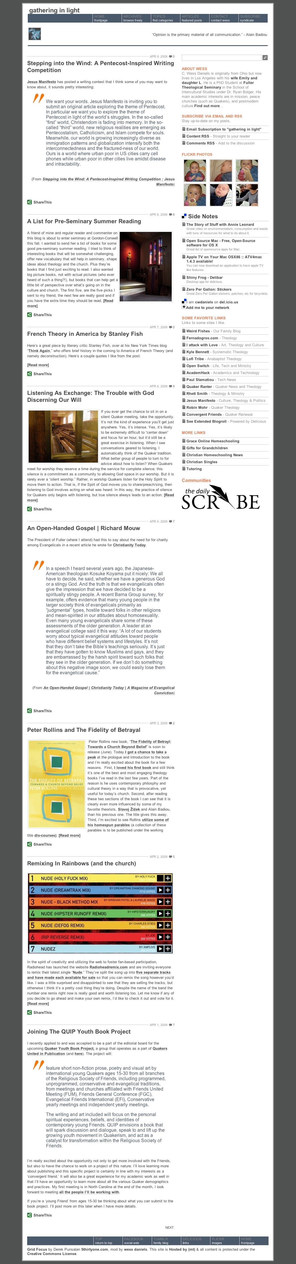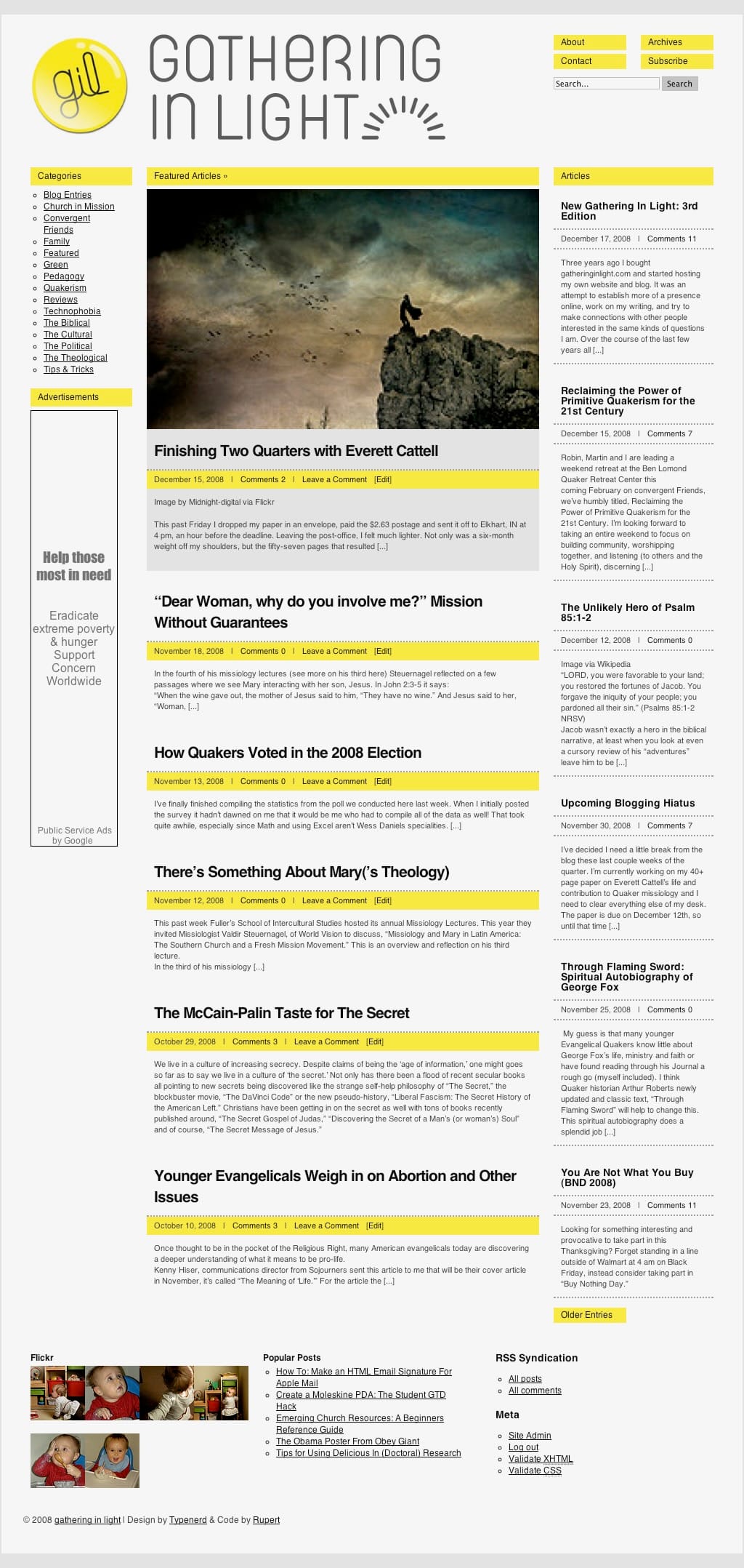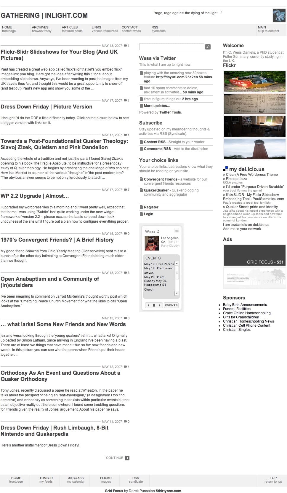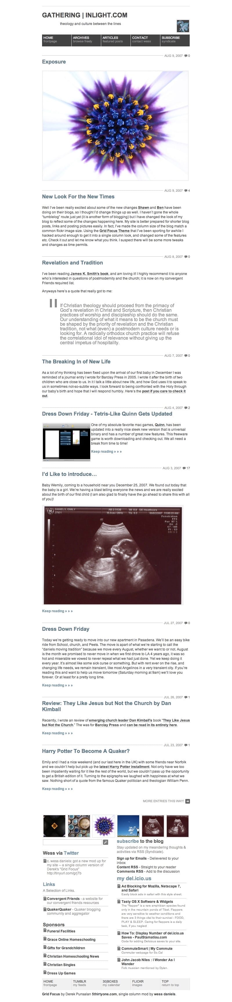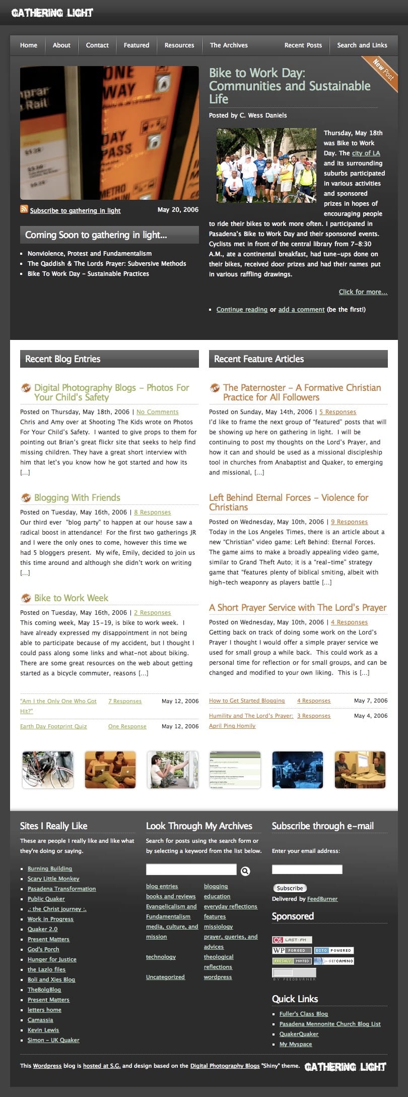 The new site takes heavy inspiration from the 2007 version of the site built by two friends in LA at the time. The grid theme allowed for posting of "blog posts" or shorter posts, and featured posts. This setup for two different kinds of content was originally inspired by an earlier theme "Shiny" that a friend ported for my use. The 2007 theme featured a new logo and bright yellows to play of "Light" in the site name. Here's that theme: