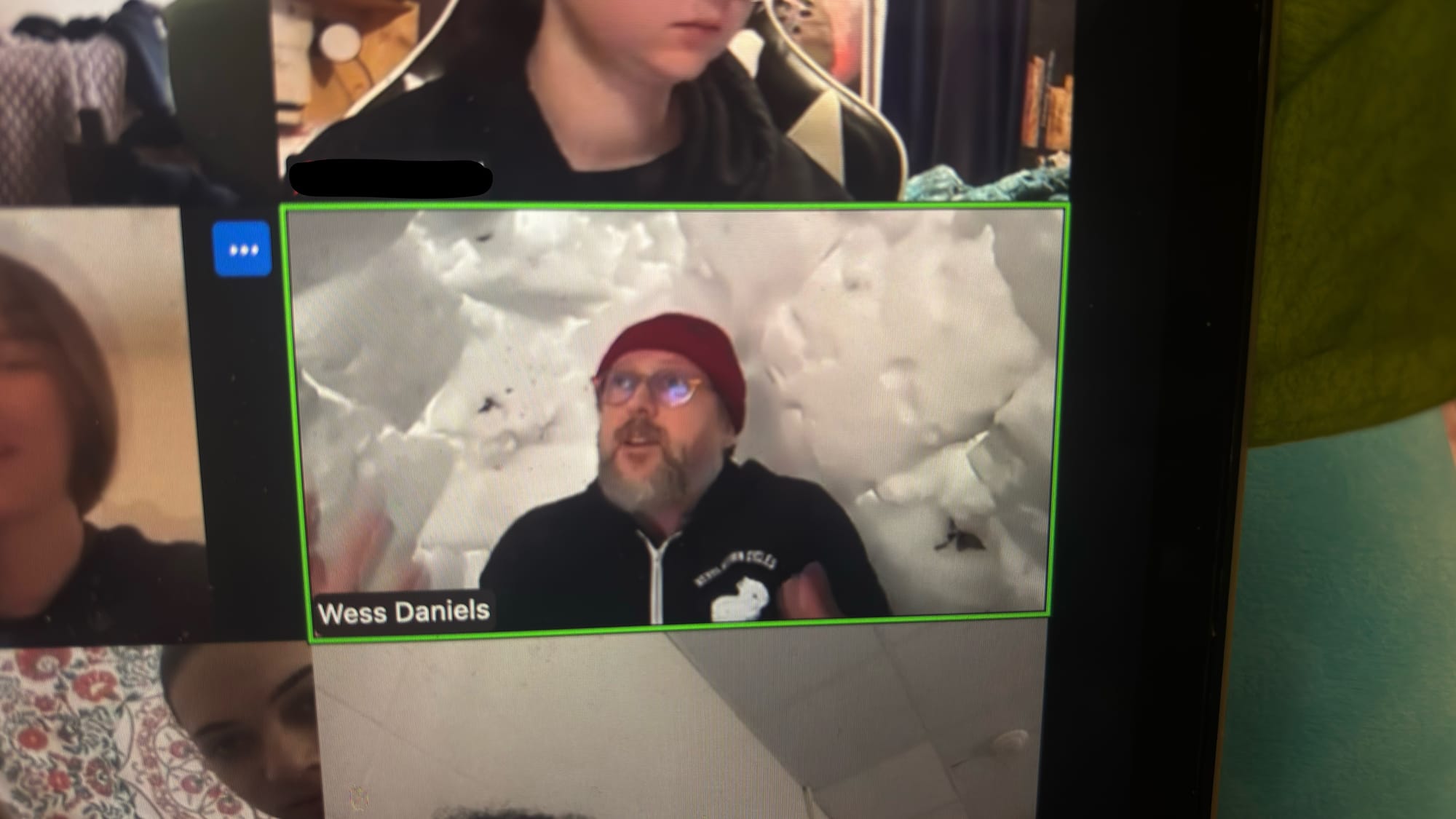 You should have seen the faces of students when they logged on. 🤣 Honestly, that was worth the whole thing. But it was fun to use it as a silly backdrop and talk about it as things came up. The igloo was really cold, which seems obvious, but I expected it would get warmer as time went on. It did not. M. and I had to step out of the igloo to warm up for a moment because toes and fingers got frosty.